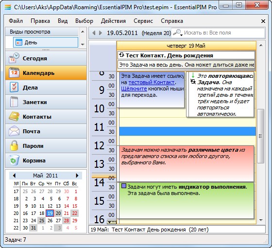 EssentialPIM - это менеджер персональной информации, который позволяет собирать и хранить различные данные в удобном, электронном виде. Все ваши задачи, дела, заметки, контакты, почта и пароли хранятся в графическом и легко доступном виде. Автоматический импорт данных из практически любого менеджера персональной информации. Синхронизация с самыми популярными онлайн сервисами, такими, как: Google, Yahoo, SyncML и CalDAV. Всё это позволяет иметь самые последние данные под рукой, доступные отовсюду, в любое время.