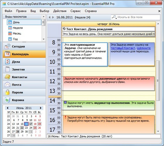 EssentialPIM Pro - это комплексный менеджер персональной информации, отличающийся продуманным интерфейсом и обилием функций. Включает в себя средства для работы с календарем, списком дел, заметками, контактами, паролями и электронной почтой. Среди особенностей: широкие возможности для печати, импорта и экспорта информации, возможность запуска с переносных USB накопителей, синхронизация с онлайн сервисами (Google, Yahoo, Funambol и т.д.), Outlook, а также с карманными компьютерами и смартфонами, работающими под управлением Windows Mobile и PalmOS.
