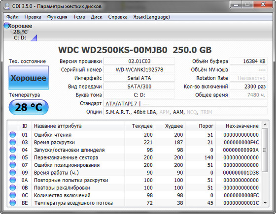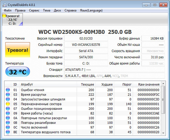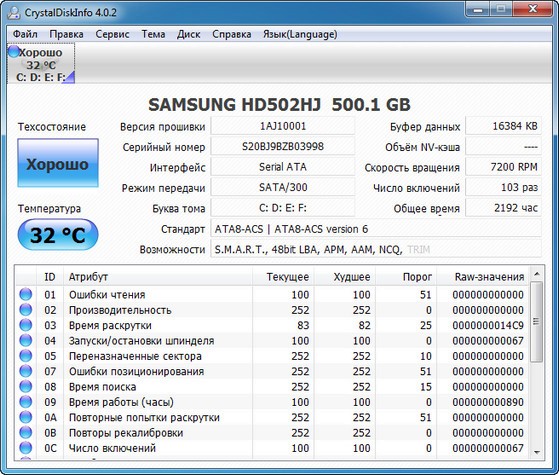 CrystalDiskInfo - отслеживает состояние жестких дисков, поддерживающих технологию S.M.A.R.T. Производит мониторинг и дает общую оценку "здоровья" вашего диска. Так же отображает детальную информацию о жестких дисках, установленных в компьютере (прошивка, серийный номер, стандарт, интерфейс, общее время работы и др.), а также выводит параметры атрибутов системы самодиагностики S.M.A.R.T. (ошибки чтения, производительность, запуски/остановки шпинделя, время поиска дорожки, количество циклов включения-выключения, ошибки секторов и многое другое).