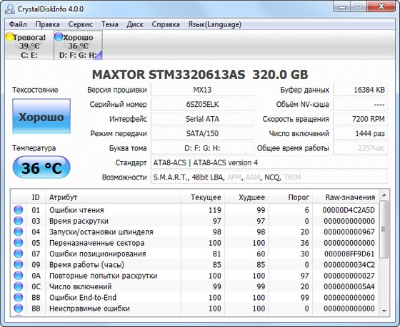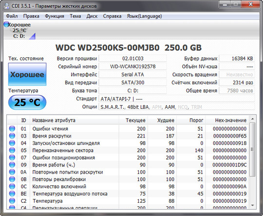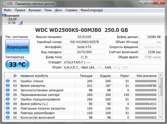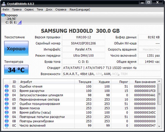 CrystalDiskInfo - утилита для мониторинга состояния жестких дисков. CrystalDiskInfo позволяет просмотреть детальную информацию о накопителях, установленных в компьютере, а также параметры системы самодиагностики S.M.A.R.T., включая текущую температуру жесткого диска и степень его "здоровья". Так же отображает детальную информацию о жестких дисках, установленных в компьютере (прошивка, серийный номер, стандарт, интерфейс, общее время работы и др.), а также выводит параметры атрибутов системы самодиагностики S.M.A.R.T. (ошибки чтения, производительность, запуски/остановки шпинделя, время поиска дорожки, количество циклов включения-выключения, ошибки секторов и многое другое).