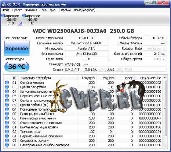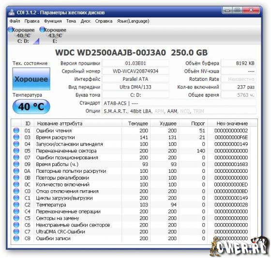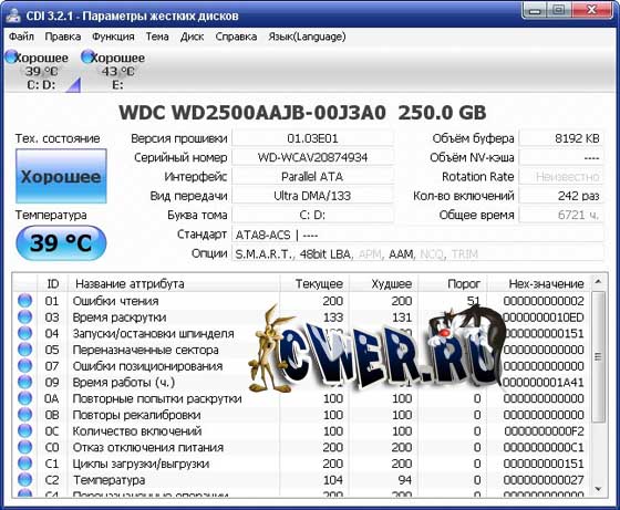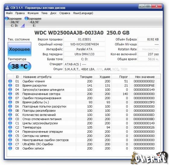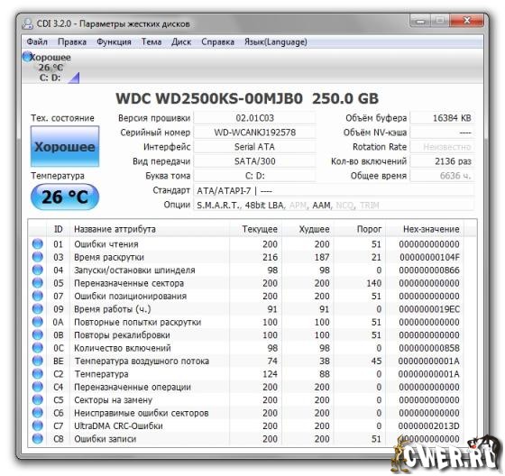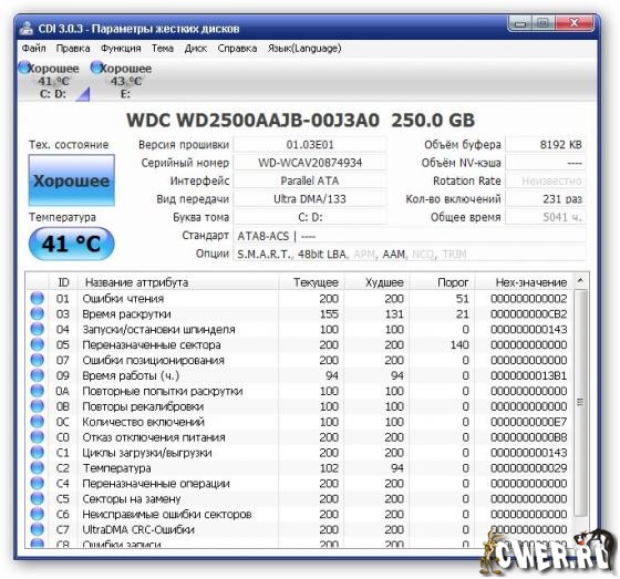 CrystalDiskInfo - утилита для мониторинга состояния жестких дисков. CrystalDiskInfo позволяет просмотреть детальную информацию о накопителях, установленных в компьютере, а также параметры системы самодиагностики S.M.A.R.T., включая текущую температуру жесткого диска и степень его "здоровья". Так же отображает детальную информацию о жестких дисках, установленных в компьютере (прошивка, серийный номер, стандарт, интерфейс, общее время работы и др.), а также выводит параметры атрибутов системы самодиагностики S.M.A.R.T. (ошибки чтения, производительность, запуски/остановки шпинделя, время поиска дорожки, количество циклов включения-выключения, ошибки секторов и многое другое).