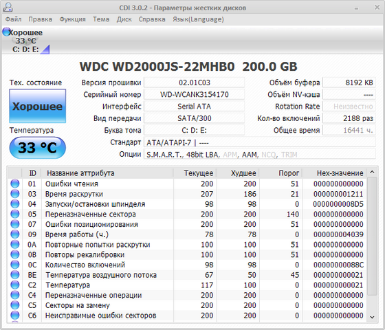 CrystalDiskInfo - отслеживает состояние жестких дисков, поддерживающих технологию S.M.A.R.T. Производит мониторинг и дает общую оценку "здоровья" вашего диска. Так же отображает детальную информацию о жестких дисках, установленных в компьютере (прошивка, серийный номер, стандарт, интерфейс, общее время работы и др.), а также выводит параметры атрибутов системы самодиагностики S.M.A.R.T. (ошибки чтения, производительность, запуски/остановки шпинделя, время поиска дорожки, количество циклов включения-выключения, ошибки секторов и многое другое).