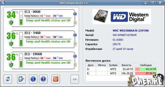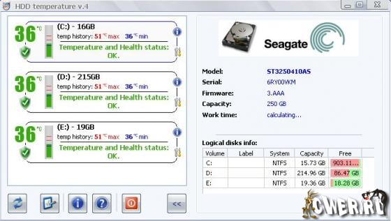 HDD Temperaturе - эта утилита выглядит иконкой в системном лотке, на которой отображается текущие температуры жестких дисков на выбор в цельсиях или файренгейтах. Есть функции перевода системы в спящий режим (hibernate) в случае перегрева винчестера, а также отправки сообщения по сети в случае перегрева жесткого диска.