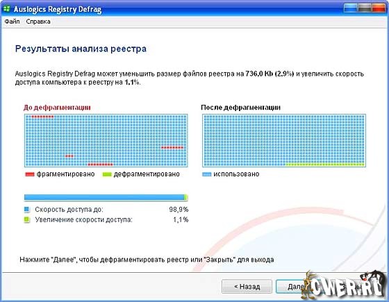 Программа для дефрагментирования реестра. Quicksys RegDefrag позволят в целом улучшить работу компьютера и повысить скорость доступа к реестру. Данные в реестре постоянно перезаписываются, удаляются и добавляются во время работы операционной системы. Через некоторое время эти данные становятся фрагментированными. Также программа оптимизирует файл реестра, удаляя из него пустые места, отдельное фрагменты и потраченное впустую место.