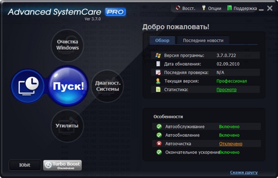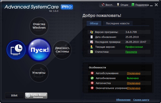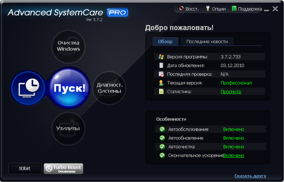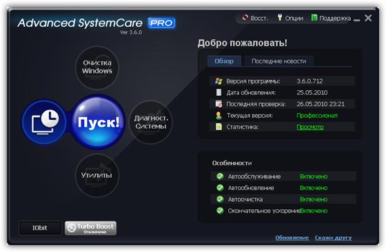 Advanced SystemCare Pro - программа, включающая в себя множество модулей для оптимизации, настройки и повышения производительности компьютеров, находящихся под управлением операционными системами Windows 2000/XP/Vista/7. Благодаря возможностям программы вы сможете очистить ПК от шпионского и рекламного ПО, обнаружить и заранее устранить возможные угрозы и бреши в системе безопасности ОС, исправить ошибки в системном реестре, очистить временные и ненужные файлы, управлять списками автозагрузок, оптимизировать работу систем.