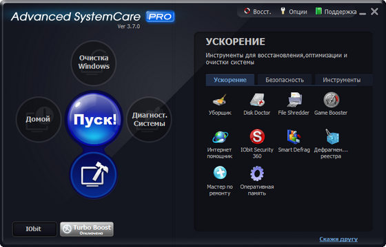 Advanced SystemCare Pro - программа включающая в себя множество модулей для оптимизации, настройки и повышения производительности компьютеров, проводит анализ системы, после чего производит оптимизацию системной конфигурации, в том числе изменяет на оптимальные настройки безопасности, удаляет из системы Spyware и Adware, исправляет ошибки в системном реестре, удаляет временные файлы, оптимизирует параметры интернет-соединения, позволяет управлять автозагружаемыми приложениями и т.д.