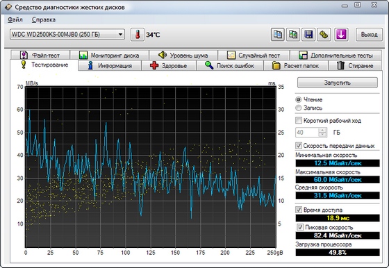 HD Tune Pro - программа для планомерного детального тестирования текущей работоспособности и производительности жестких дисков / SSD с различными интерфейсами (SCSI, SATA или IDE), а так же карт памяти и flash-дисков. Программа производит замер и наглядно отображает такие параметры накопителей, как скорость передачи данных, время чтения, записи и время доступа, уровень загрузки процессора, температуру винчестера, показывает в виде сводной таблицы данные поставляемые S.M.A.R.T, позволяет сканировать жесткие диски и другие накопители на предмет наличия ошибок, выдает информацию о версии firmware, серийном номере, объеме диска и подробности по потребителям полезной площади, его КЭШа, возможном и активном режимах передачи данных и т д. и т.п.