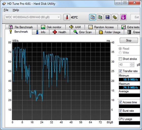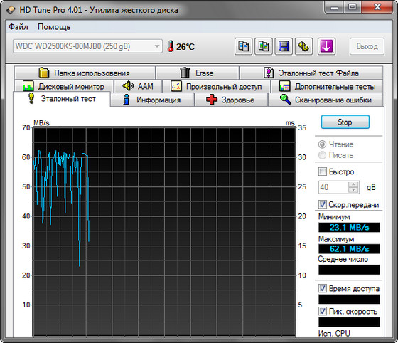 HD Tune Pro - программа для планомерного детального тестирования текущей работоспособности и производительности жестких дисков с различными интерфейсами (SCSI, SATA или IDE), а так же карт памяти и flash-дисков. Программа производит замер и наглядно отображает такие параметры накопителей, как скорость передачи данных, время чтения, записи и время доступа, уровень загрузки процессора, температуру винчестера, показывает в виде сводной таблицы данные поставляемые S.M.A.R.T, позволяет сканировать жесткие диски и другие накопители на предмет наличия ошибок, выдает информацию о версии firmware, серийном номере, объеме диска и подробности по потребителям полезной площади, его КЭШа, возможном и активном режимах передачи данных и т д. и т.п.