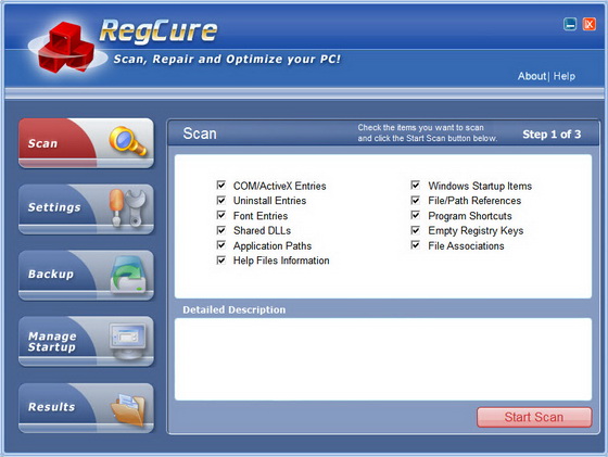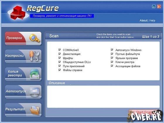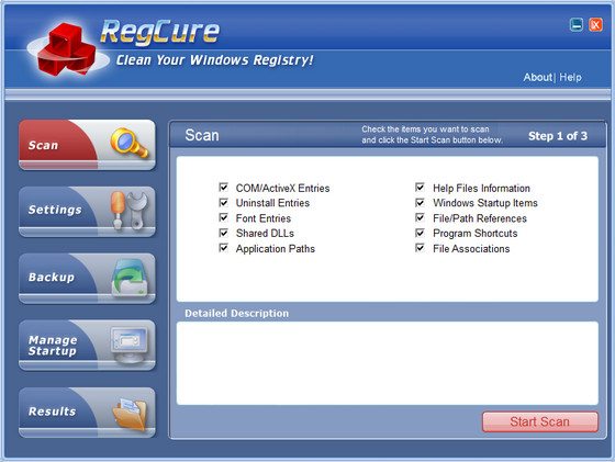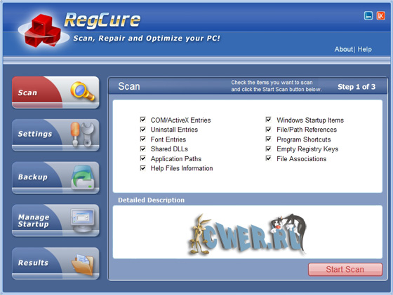 RegCure - программа, которая быстро и эффективно просканирует и очистит системный реестр Windows для того, чтобы ваш компьютер мог работать с максимальным уровнем быстродействия. Эта программа позволит вам удалять ошибки в реестре вручную, в зависимости от ваших требований или автоматически выполнит его тщательное сканирование и очистку. Дружественный пользовательский интерфейс, позволит Вам контролировать прогресс сканирования, настроить RegCure на сканирование в удобное для вас время, а так же удалять и управлять автоматически запускаемые программы.