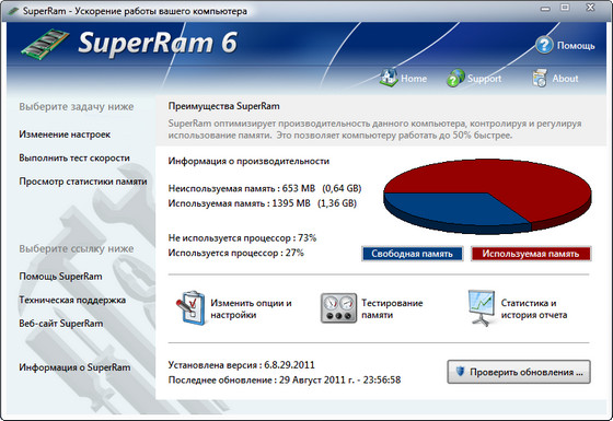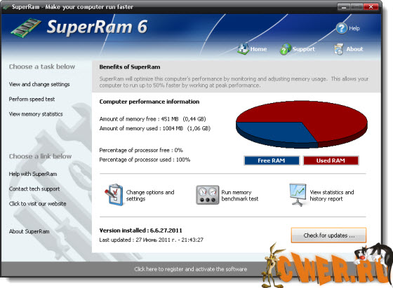 SuperRam - это инструмент для оптимизации и управления компьютерной памятью. Работать с программой просто - с ней справится даже человек, никогда раньше не работавший с подобными утилитами. Вам будет достаточно выбрать объем памяти, который будет использоваться, и объем, который следует освободить, после чего нажать кнопку "ОК". Остальное сделает SuperRam. Эффект, как уверяют создатели программы, будет заметен моментально - выразится это, конечно же, в первую очередь, в быстродействии программ, которые до этого могли отчаянно "тормозить". Кроме этого, программа всегда покажет вам график, на котором ясно видно, какой объем памяти используется, а какой - свободен.