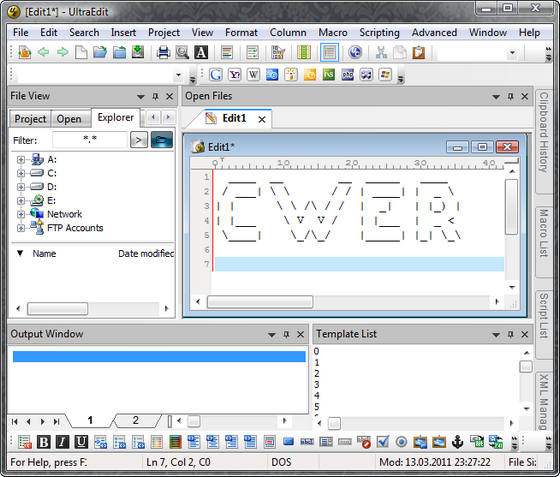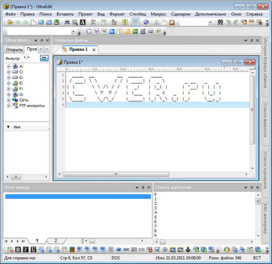 UltraEdit - программа базируется, как мощная замена Windows Notepad и даже более широко. Его можно использовать в качестве текстового редактора из-за его способности работать с несколькими документами одновременно, большими файлами. Кроме этого мощный поиск / найти / заменить функциональность, универсальность, проверка и мощный многооконный текстовый редактор с гибкой системой настроек, который также имеет встроенный FTP клиент для закачки документов на ваш сервер. С помощью этой программы вы сможете редактировать текстовые, HEX и HTML файлы размером до 2 гбайт. В программе имеется функция подсветки синтаксиса для различных языков, включая C/C++, VB, HTML, Java, Perl, FORTRAN и LaTex.