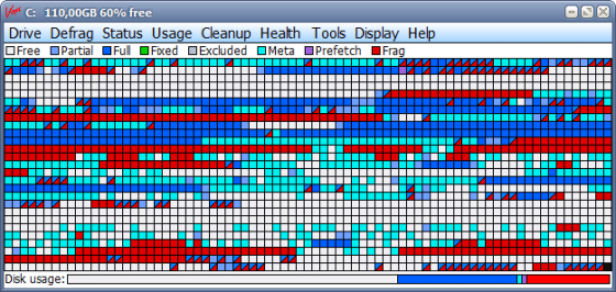 Миниатюрный дефрагментатор, почти ничем не уступающий признанным лидерам - O&O Defrag и Perfect Disk. Работает также быстро, а результат его трудов - полностью дефрагментированный диск. Оптимизируется в том числе и свободное место, дабы избежать быстрой фрагментации в будущем. Благодаря встроенному планировщику дефрагментацию можно автоматизировать. Русский язык есть.