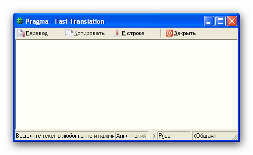 Pragma 5 - это многоязычная программа машинного перевода для перевода текстовых документов с одного языка на другой. Программа поддерживает семь языков: английский, русский, украинский, немецкий, латышский, польский и французский. Pragma выполняет перевод непосредственно в окне активного приложения или в отдельном окне быстрого перевода. С помощью программы можно переводить текстовую информацию, представленную в виде документов MS Word, Интернет страниц, почтовых сообщений, справок, а также содержимое различных текстовых окон. За счет автоматизации многих функций Pragma очень проста в использовании. В отличие от других программ машинного перевода, в проекте Pragma используется многоязычная технология перевода, в которой для выбранного количества языков поддерживаются все возможные направления перевода. К примеру, для трех языков - английский, русский и украинский существует 6 направлений перевода: англо-русский, русско-английский, англо-украинский, украино-английский, русско-украинский, украино-русский.
