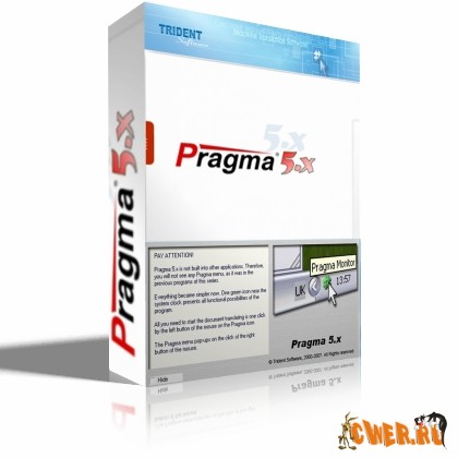 Pragma — это многоязычная программа машинного перевода текстовых документов с одного языка на другой. Программа включает семь переводных словарей: английский, русский, украинский, немецкий, латышский, польский и французский.
