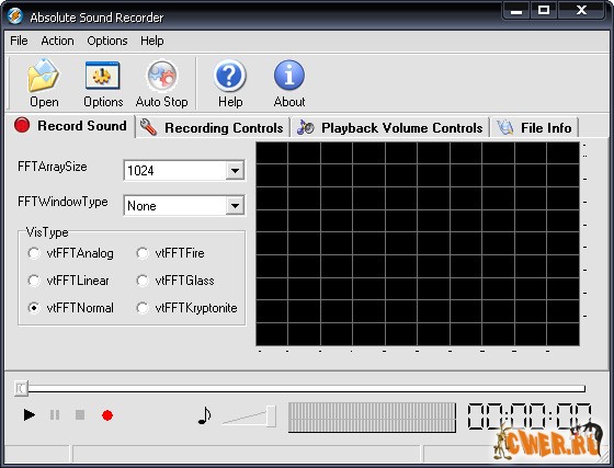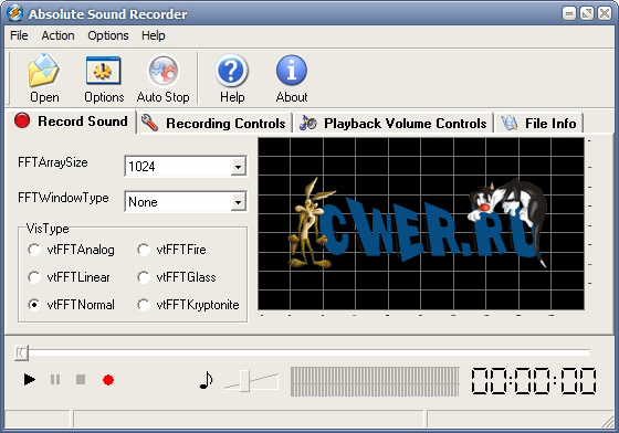 Absolute Sound Recorder - позволяет записать звук с любого источника: микрофон, линейный вход, аудио сигналы из Интернет, аудио/видео проигрывателя, игрушек и любой другой звуковой сигнал который поступает на звуковую карту. Записанный звук Absolute Sound Recorder может сохранить в большинстве распространенных аудио форматах, среди которых WAV, MP3, WMA и т.д.