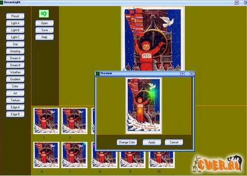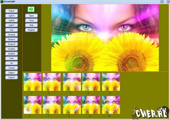DreamLight Photo Editor - программа, с помощью которой можно добавлять к цифровым фотографиям различные спецэффекты. DreamLight Photo Editor содержит 15 различных фильтров, у каждого фильтра есть по 10 различных эффектов, причем, на одну фотографию можно накладывать сразу несколько фильтров. Среди добавляемых эффектов есть такие, как: различные световые фильтры, звезды, специальные фильтры, делающие снимки очень впечатляющими и мечтательными.