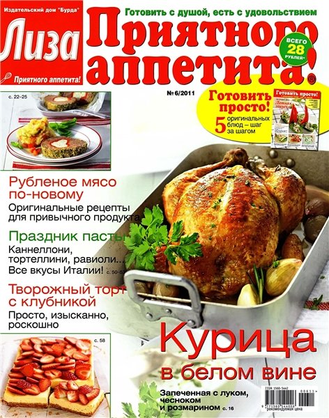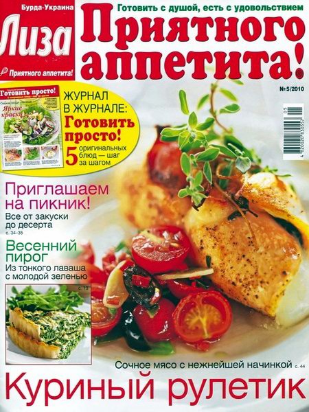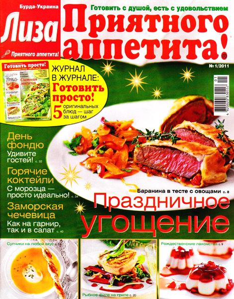 Журнал для тех, кто любит готовить, печь и радовать близких кулинарными сюрпризами. Издание предлагает яркий аппетитный мир всем, для кого готовить — радость, а есть — удовольствие. Это журнал, целиком посвященный только одной теме — домашней кулинарии. На страницах издания — лучшие рецепты русской кухни и самое вкусное со всего света, советы по приготовлению традиционных и экзотических блюд. Эффектный и несложный в исполнении, любой рецепт журнала может стать «фирменным» для любителя готовить дома. В журнале «Лиза. Приятного аппетита!» — рецепты от звезд, обеды для всей семьи, новинки из магазинов, аппетитные новости, школа поварят.