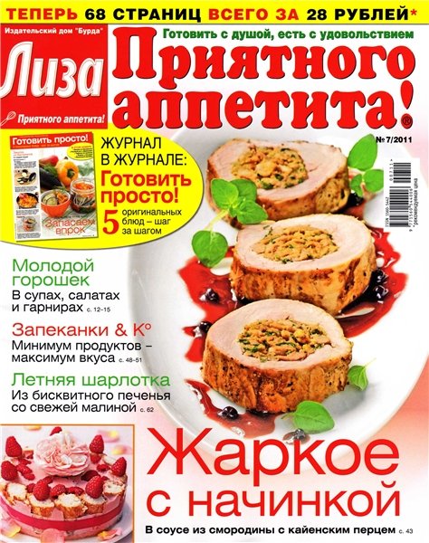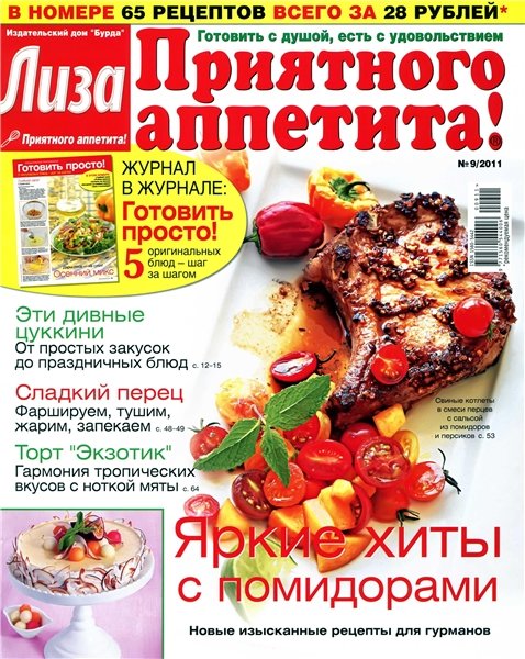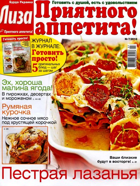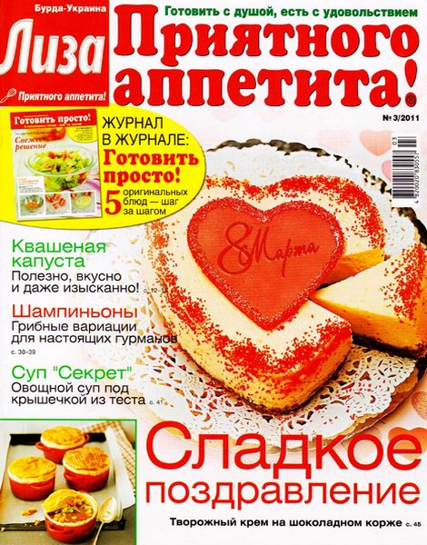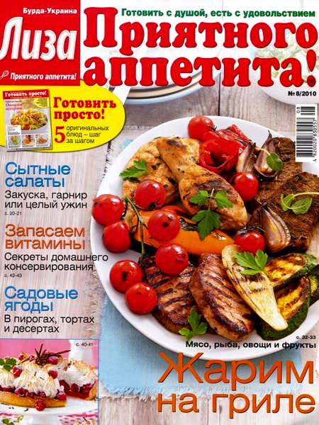 "Лиза. Приятного аппетита!" — журнал для тех, кто любит готовить, печь и радовать близких кулинарными сюрпризами. Издание предлагает яркий аппетитный мир всем, для кого готовить — радость, а есть — удовольствие. Это журнал, целиком посвященный только одной теме — домашней кулинарии.