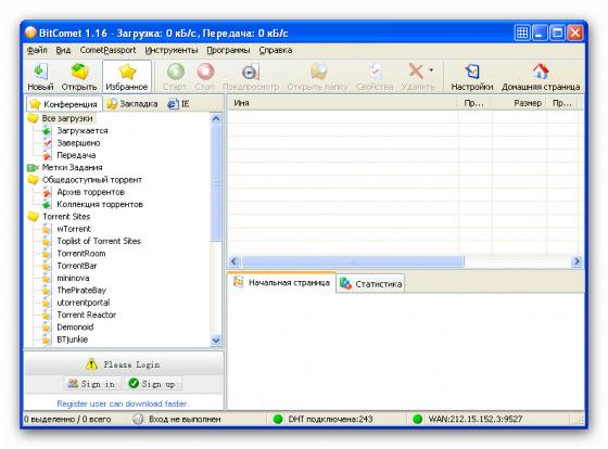 BitComet - мощный и удобный torrent клиент. Поддерживает параллельные закачки, очередь, докачку, присутствует чат, переназначения портов, возможность фильтрации по IP, имеются настройки для ограничения скорости. Программа обладает интуитивно понятным интерфейсом, с которым справится любой начинающий пользователь и без труда освоит работу с этим клиентом.