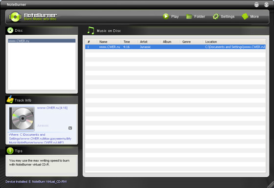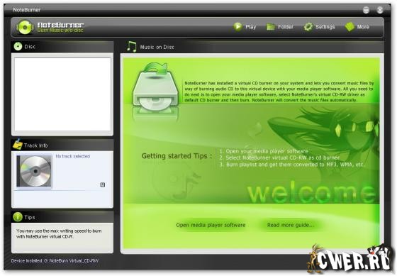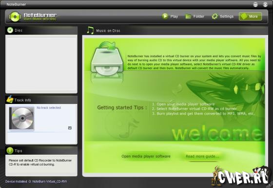 NoteBurner ─ конвертер аудиофайлов, способный освобождать аудиофайлы от защиты DRM, которая ограничивает права воспроизведения музыки на компьютерах и портативных устройствах. Поддерживает работу с форматами WMA, M4P, AA, M4B, MP4 и может преобразовывать их в незащищенные файлы MP3, WAV и WMA. Для конвертирования используется виртуальное устройство CD-RW, которое добавляется в систему после установки программы. Созданные аудиофайлы содержат те же ID3-теги что и исходные файлы, в том числе название песни и альбома, имя исполнителя и т.д.