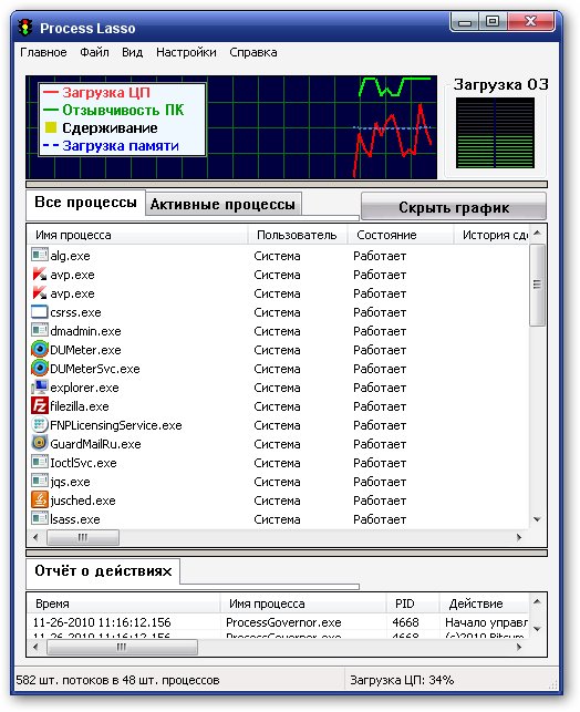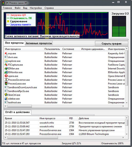 Process Lasso Pro - небольшая утилита, позволяющая вручную или автоматически манипулировать процессами, запущенными на вашем компьютере для достижения максимального быстродействия и стабильности. Эта утилита не является заменой стандартному менеджеру процессов, она, скорее, добавляет новые функции, которые позволяют оптимизировать работу ЦПУ при максимальной нагрузке. Программа дает возможность определить приоритет процессов, причем, по желанию пользователя приоритет будет задан и для всех последующих запусков. Также при помощи этой утилиты можно выполнить завершение работы нежелательных процессов. Кроме этого, программа позволяет вести статистику запущенных процессов. Программа имеет отдельную версию для 64-битных систем, а интерфейс программы обладает поддержкой русского языка.