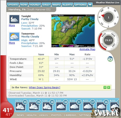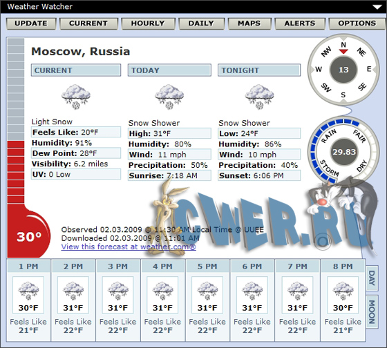 Weather Watcher - программа для получения прогноза погоды. Последняя автоматически скачивает и показывает сводку погоды в реальном времени и на последующие часы и дни. Прогноз погоды доступен для 77 тысяч городов мира. Сводка включает информацию о состоянии неба (солнечно или облачно), температуре, давлении, влажности, скорости и направлении ветра, а также показывает дальность видимости. Отдельно отображаются предупреждения о стихийных бедствиях...