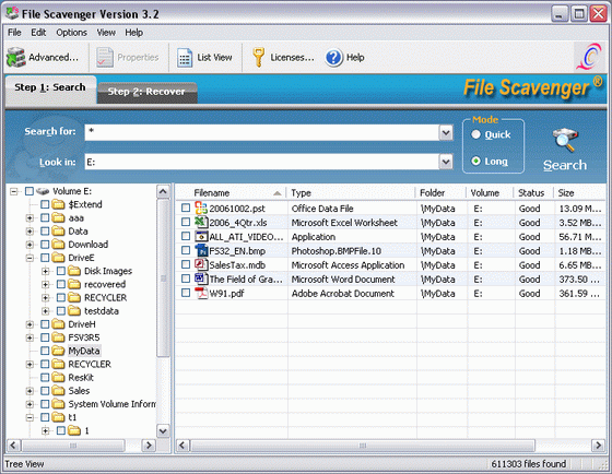 File Scavenger - утилита для восстановления удаленных и поврежденных файлов. Работает в системах NTFS, FAT 32/16/12. File Scavenger позволяет исправлять поврежденные вирусами файлы, восстанавливать удаленные файлы из корзины, а также файлы, которые были удалены из режима командной строки. Может исправлять длинные имена файлов, а так же имена в неправильной кодировке. Поддерживает RAID-массивы и сжатые диски. Кроме того, может быть восстановлен и сам файл, и путь, ведущий к файлу на жестком диске.