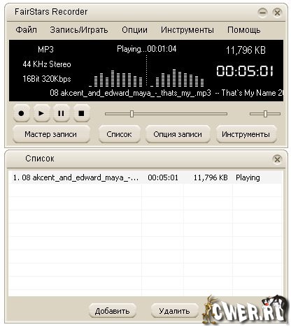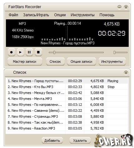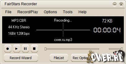 FairStars Recorder -программа для записи аудио в реальном времени с полной поддержкой WMA, MP3, OGG, APE и WAV. Утилита записывает звук непосредственно с звуковой карты или микрофона. Предоставляет профессиональные возможности возможности записи в реальном времени.