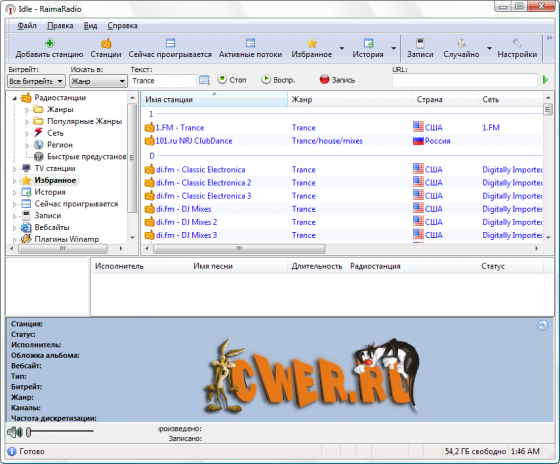 RaimaRadio - программа для прослушивания и записи интернет-радиостанций. Обладает большим набором возможностей, обеспечивая комфортное прослушивание радиостанций и удобную запись транслируемых данных. Программа содержит множество станций рассортированных на группы в зависимости от жанра музыки, битрейта, сети и региона, имеет функцию поиска станций, автоматически скачивает из Интернета информацию о проигрываемых песнях, включая альбомную графику, и поддерживает подключение плагинов медиаплеера Winamp. С помощью RaimaRadio можно слушая одну станцию, одновременно записывать несколько других интернет-радиостанций, осуществлять запись интернет-вещания по расписанию, а также автоматически начинать запись, в случае если заиграла определенная композиция. При сохранении полученных аудио файлов RaimaRadio добавляет в них теги.