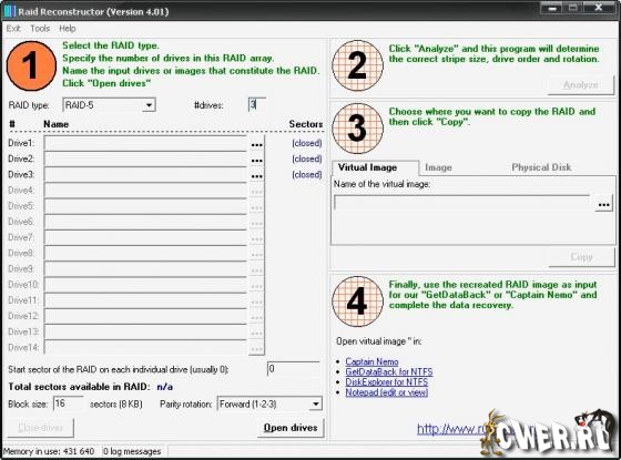 Мощная программа с большим набором функций и инструментов для востановления данных с поврежденных дисковых массивов (RAID) 5 уровня. RAID Reconstructor Recover Data from a broken RAID Level 5 or 0 Array.