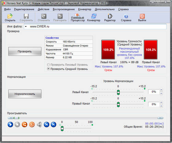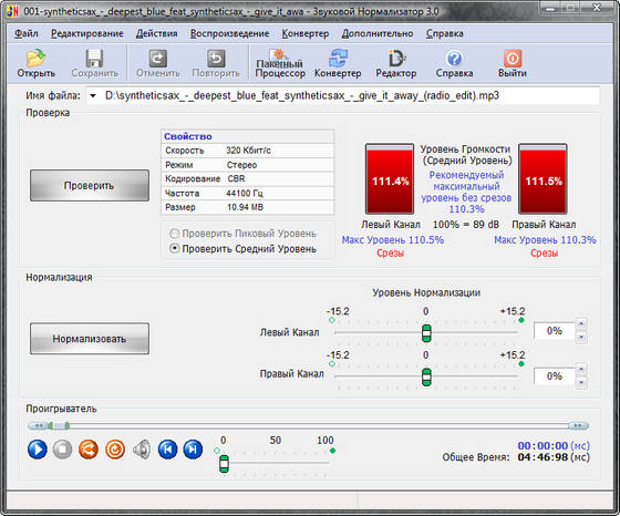 Sound Normalizer - звуковой нормализатор звука, предназначенный для повышения или восстановления уровня громкости музыкальных WAV и MP3 файлов, причем отдельно по каждому каналу. Уровень громкости отображается в графическом виде с использованием процентного значения. WAV-нормализация выполняются по пиковому уровню(пиковая нормализация), а MP3-нормализация по стандарту Replay Gain. Алгоритм Replay Gain работает, используя психоакустический анализ обрабатываемого файла для определения воспринимаемого человеком уровня громкости. Replay Gain основан на среднеквадратическом анализе Root Mean Square(RMS) и сама MP3-нормализация производится по среднему уровню громкости(RMS нормализация). Эта программа проста в использовании и даёт быстрые и превосходные результаты качественного звука. Имеется возможность пакетной обработки.