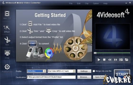4Videosoft Mobile Video Converter - это конвертер медиа файлов между собой, для просмотра фильмов и прослушивания музыки на любых мобильных устройствах и плеерах, будь то Nokia, Palm Pre, Sony Ericsson, iPhone, PSP, BlackBerry или Zune и т д. , не важно. Имеет богатые функции редактирования для нарезки и слияния разрозненных кусков, придания им более красочности и выразительности и подгонкой для полной совместимости с вашим плеером или мобильником. Конвертирует между собой следующие форматы: видео - 3GP, 3G2, MP4, AVI, WMV, H.264/MPEG-4 AVC(.mp4); аудио - AAC, MP3, M4A, MP2, WAV, WMA, и поддерживает любые мобильные дивайсы.