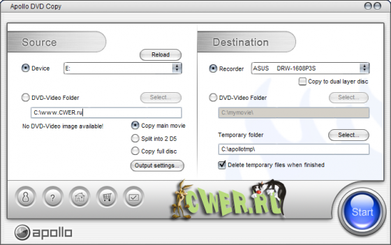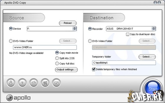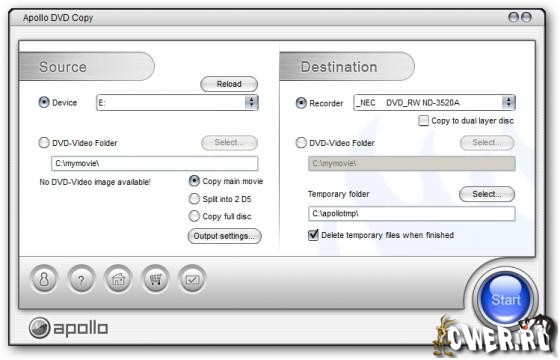 Apollo DVD Copy - является превосходным инструментом для конвертирования один к одному DVD на DVD-R/RW или DVD+R/RW носители или жесткий диск для последующего прожига, программа позволяет разбивать двухслойные диски (DVD9) на два диска (DVD5), также позволяет редактировать содержимое DVD диска (удаление ненужных файлов, добавление новых, поддержка: NTSC и PAL видео, большинства SCSI, IDE, USB DVD пишущих приводов.