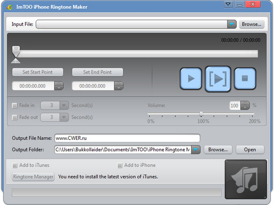 ImTOO iPhone Ringtone Maker - программа для создания рингтонов для вашего iPhone из mp3, wav, ogg и других музыкальных файлов вашей коллекции. Программа имеет встроенный звуковой редактор, который с легкостью поможет вам вырезать определенный участок композиции и наложить на него звуковые эффекты, делая звук более громким и насыщенным и в последствии перекинет его к вам на iPhone.