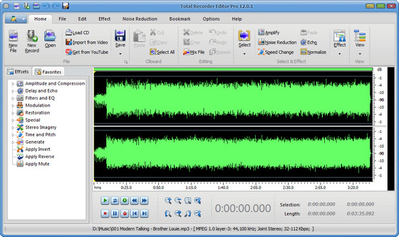 Total Recorder Editor Pro - программа для записи с практически любого источника звука - линейного входа, CD/DVD, микрофона, умеет вести запись телефонных бесед через интернет или интернет-радиостанций. Можно записывать все, что проигрывается любым медиаплеерами, а также записать музыку из игры или любой другой программы. Запись звука происходит в WAV, MP3, WMA и OGG. Имеется мощная функция редактирования записанного, с применением различных эффектов и визуализации обработки, прожига на CD.