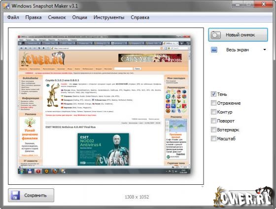 WinSnap - утилита, которая позволяет с легкостью делать скриншоты и редактировать полученные изображения. Программа способна захватывать скриншоты нестандартных окон (непрямоугольной формы) с выбранным вами фоном, накладывать тени, автоматически исправлять некоторые недостатки в графике, сохранять результаты в различных форматах, обрабатывать закругленные края окон. Возможно применение различных эффектов: вставка "подписи" (т.е. водяной знак в виде графического файла), контур, тень, поворот, масштабирование, коррекция цвета. Имеется расширенная настройка функции автоматического сохранения файлов.
