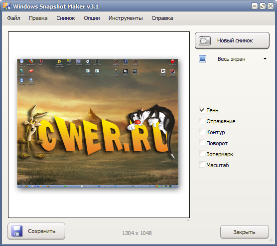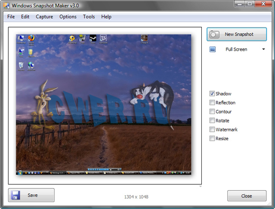 WinSnap позволяет делать скриншоты экрана монитора и редактировать полученные изображения. WinSnap может захватывать скриншоты нестандартных окон, которые имеют не строго прямоугольную форму. Кроме того, программа способна автоматически исправлять некоторые недостатки в графике, накладывать тени, сохранять результаты в большинстве графических форматах.