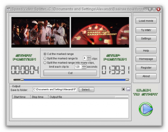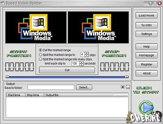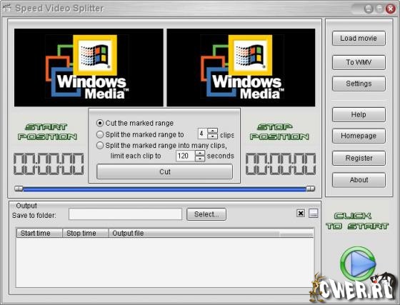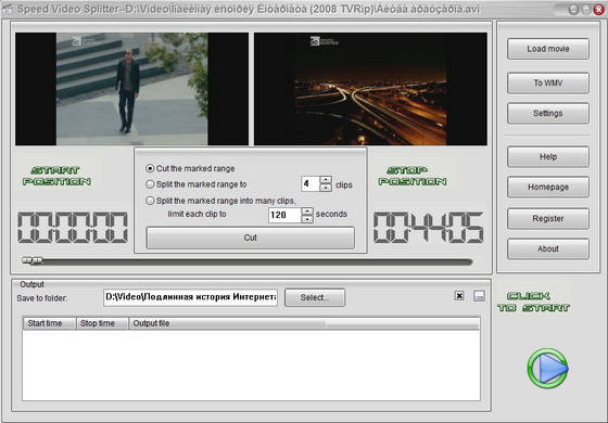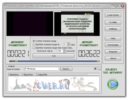 Speed Video Splitter - нарезка на фрагменты больших видео файлов. Поддержка AVI (Divx, xDiv), MPEG-4, mpeg (vcd, svcd, dvd compatible), wmv, asf, Quick Time, VOB, DAT видео форматов, сохранение фрагментов в любом поддерживаемом формате, простой и удобный интерфейс, высокая скорость и высокое качество нарезки.