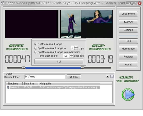 Speed Video Splitter - Нарезка на фрагменты больших видео файлов. Поддержка AVI (Divx, xDiv), MPEG-4, mpeg (vcd, svcd, dvd compatible), wmv, asf, Quick Time, VOB, DAT видео форматов, сохранение фрагментов в любом поддерживаемом формате, простой и удобный интерфейс, высокая скорость и высокое качество нарезки.
