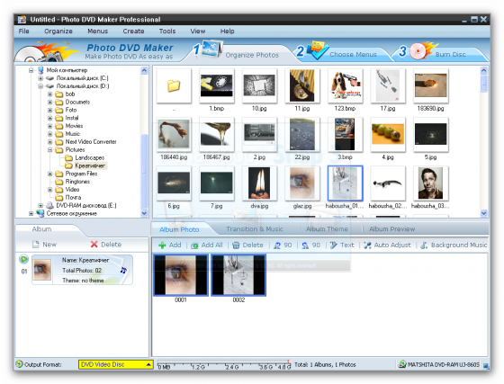 Photo DVD Maker Pro - является мощным и удобным в работе приложением для создания ошеломляющих слайд-шоу. Являетесь ли вы экспертом или новичком, это не имеет значения, программа проста и удобна в обращении. Особенности: создание непрерывного слайдшоу из фотографий или видео роликов неограниченного количества, наложение и соединение со звуковыми файлами (фоновая музыка), текстами, создание титров и субтитров, наложение эффектов перехода с выбором из более 360 эффекта перехода, создание проекта и прожиг в DVD,VCD или SVCD форматах для последующего просмотра на любом домашнем проигрывателе,iPod, Sony PSP, или сотовом телефоне.