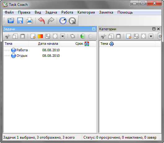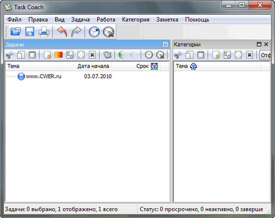 Task Coach - это программа-органайзер для записи текущих дел на самые разнообразные темы. Возможно построение древовидной структуры дел, отображение списком и многое другое. Очень проста в использовании, имеет русский интерфейс. Программа появилась в результате неудовлетворенности доступными ныне менеджерами задач, например Outlook или Lotus Notes, которые не обладают инструментами для создания сложных задач. Часто задачи или важные дела состоят из нескольких действий. Task Coach способен составлять сложные задачи.