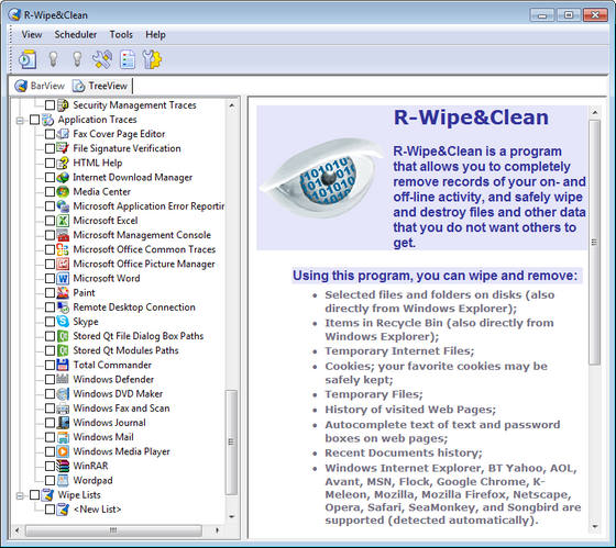 R-Wipe & Clean - это эффективная утилита очистки дискового пространства и сохранения конфиденциальности информации. R-Wipe&Clean полностью удалит временные интернет файлы, журнал посещенных страниц, куки, автозаполняемые формы и пароли, файлы подкачки, список недавно использовавшихся документов, список часто используемых компонентов, хранящихся в системном реестре, временные файлы и т.д. Это сделает невозможным восстановление конфиденциальной информации о вашей сетевой или локальной активности.