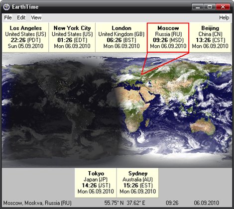 EarthTime - программа для показа локального времени и даты любого места земного шара. Программа имеет встроенную базу данных более 3000 городов Земли, а также позволяет пользователю добавлять любое количество собственных локаций. Позволяет устанавливать будильники на любое локальное время любого города нашей планеты. Множество опций в данной программе предоставляют пользователю гибкие настройки часовых поясов и локального времени.