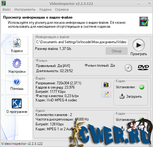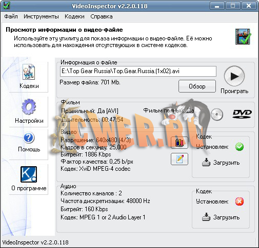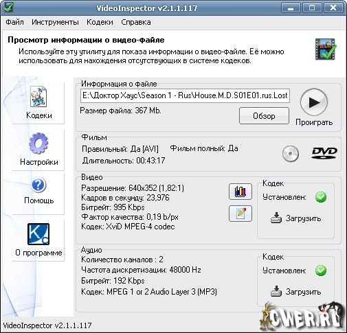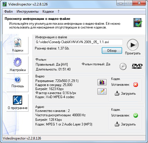VideoInspector - отображает информацию о видеофайле - сведения о видеокодеке, которым был закодирован файл, об аудиокодеке, видеоразрешении, FPS, BitRate, Qualite Factor и другие. Поддерживаются форматы AVI, Matroska, MPEG I, MPEG II, QuickTime. Кроме этого, VideoInspector имеет еще одну очень полезную опцию, а именно возможность быстрого перехода на веб-страницу для загрузки недостающего кодека.