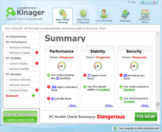 Wondershare Kinager - программное обеспечение для настройки и защиты компьютера, а также мобильного устройства на базе android. Данная программа может автоматически диагностировать и устранять проблемы ПК, такие как медленная загрузка, ошибки или не нужные записи реестра, зависания компьютера, очистка от ненужных файлов и т.д.