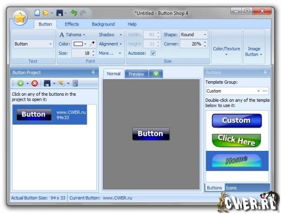 Программа для создания кнопок, которые могут быть использованы в различных приложениях Web. Для работы с Button Shop не требуется специальных знаний HTML и Javascript. В комплект поставки включено свыше 200 готовых шаблонов и текстур, используя которые можно быстро и легко скомпоновать нужные кнопки. Button Shop автоматически генерирует код, готовый к использованию в проектах. Поддерживаются графические форматы BMP, GIF, JPEG, PNG, TIFF, EXIF, WMF, EMF, ICON, настройка цвета отдельных частей кнопок, прозрачность и другие эффекты.