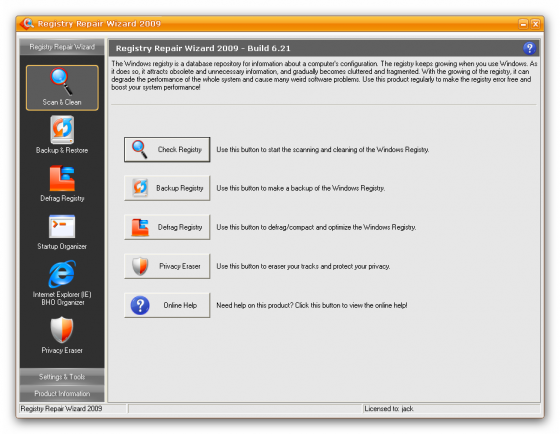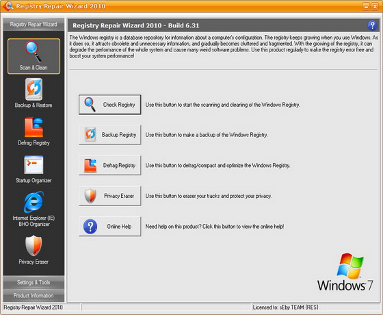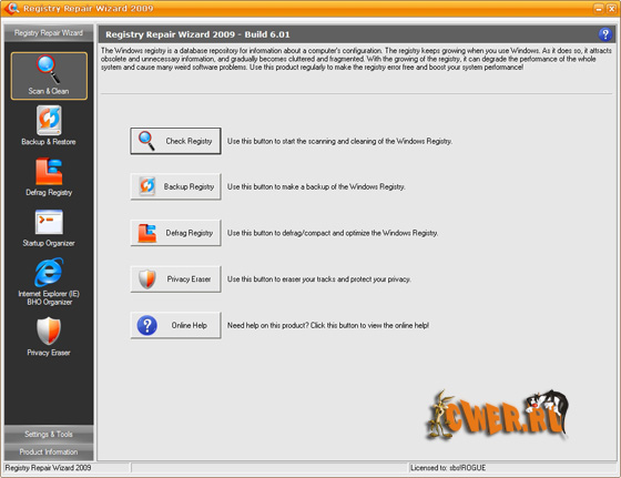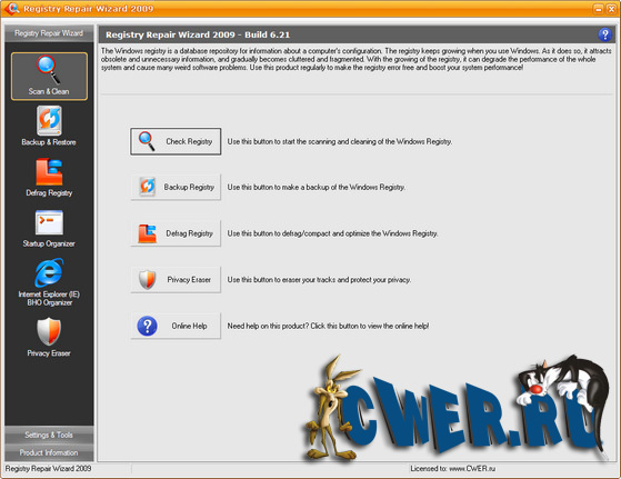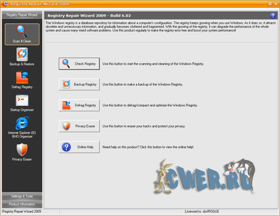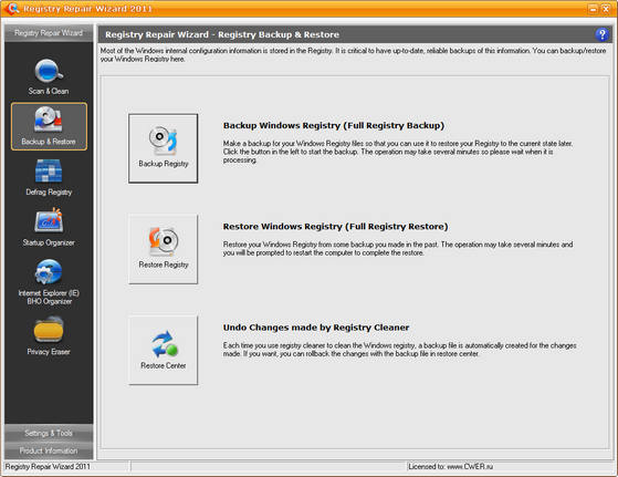 Registry Repair Wizard - программа для очистки реестра, которая позволит вам сканировать, восстанавливать и очищать системный реестр Windows несколькими щелчками мыши. Проблемы с системным реестром это наиболее общая причина аварий Windows и сообщений об ошибках. Функция полного резервного копирования реестра позволит вам его восстановить в дальнейшем, в случае любой системной аварии. Кроме того, эта утилита может уничтожать троянов, использующих реестр для своего распространения, и которые могут повредит вашу систему. Функции дефрагментации реестра и очистки приватных данных повышают функциональность программы и помогают вашему компьютеру работать значительно быстрее и без каких-либо ошибок.