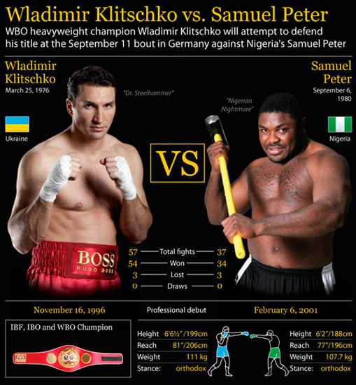 11 сентября 2010 во Франкфурте, Германия, на футбольном стадионе «Commerzbank-Arena» состоялся чемпионский поединок за титулы IBF, IBO и WBO в супертяжелом весе (свыше 90,7 кг) между их действующим обладателем 34-летним украинцем Владимиром Кличко и 30-летним Сэмюэлем Питером из Нигерии. Первый поединок между Кличко и Питером, прошедший пять лет назад, завершился победой украинца по очкам, хотя по ходу встречи Владимир трижды побывал на полу. В нынешнем противостоянии специалисты и букмекеры также отдавали явное предпочтение Кличко.