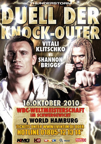 16 октября 2010 на арене «O2 World» в Гамбурге, Германия, состоялось боксерское шоу, главным событием которого стал бой за звание чемпиона мира в супертяжелом весе по версии WBC. Действующий обладатель пояса украинец Виталий Кличко проводил очередную защиту титула в поединке с экс-чемпионом мира американцем Шенноном Бриггсом. Накануне боя Бриггс по традиции сделал немало громких заявлений по поводу «завершения карьеры великого чемпиона», но Кличко оставался явным фаворитом противостояния.