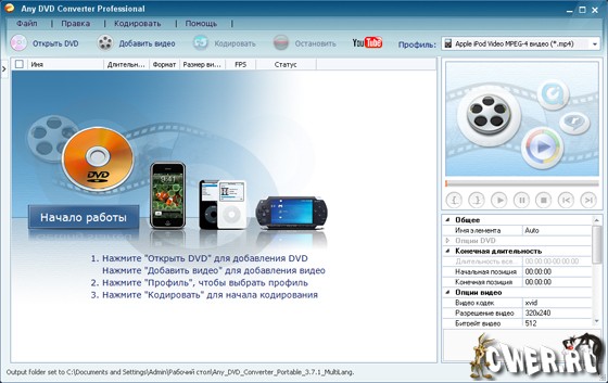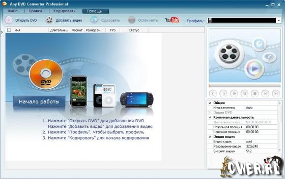 Any DVD Video Converter является инструментом для преобразования видео с простым в использовании графический интерфейсом, быстрой скоростью преобразования и отличного качество видео. Он позволяет вам легко конвертировать видео файлы между каждого формата! Она может конвертировать почти все видео форматы, включая DivX, XviD, MOV, RM, RMVB, MPEG, VOB, DVD, WMV, AVI с MPEG-I, MPEG-I, DVD NTSC, PAL DVD, Flash для видео (FLV), AVI Видео и заказной фильм форматы WMV. Any Video Converter позволяет легко использовать любой формат видео с вашей PSP, мобильном телефоне или MP4 плеере. Он также поддерживает любые определенные пользователем видео форматы файлов, как выход.